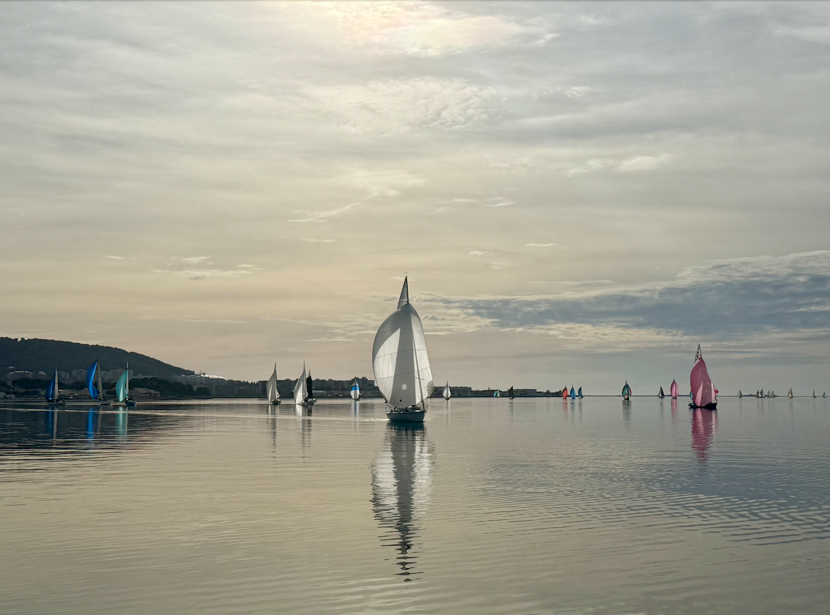 Le retour au port des bateau se fait dans un vent soutenu, mollissant légèrement et accompagné d'un magnifique coucher de soleil.